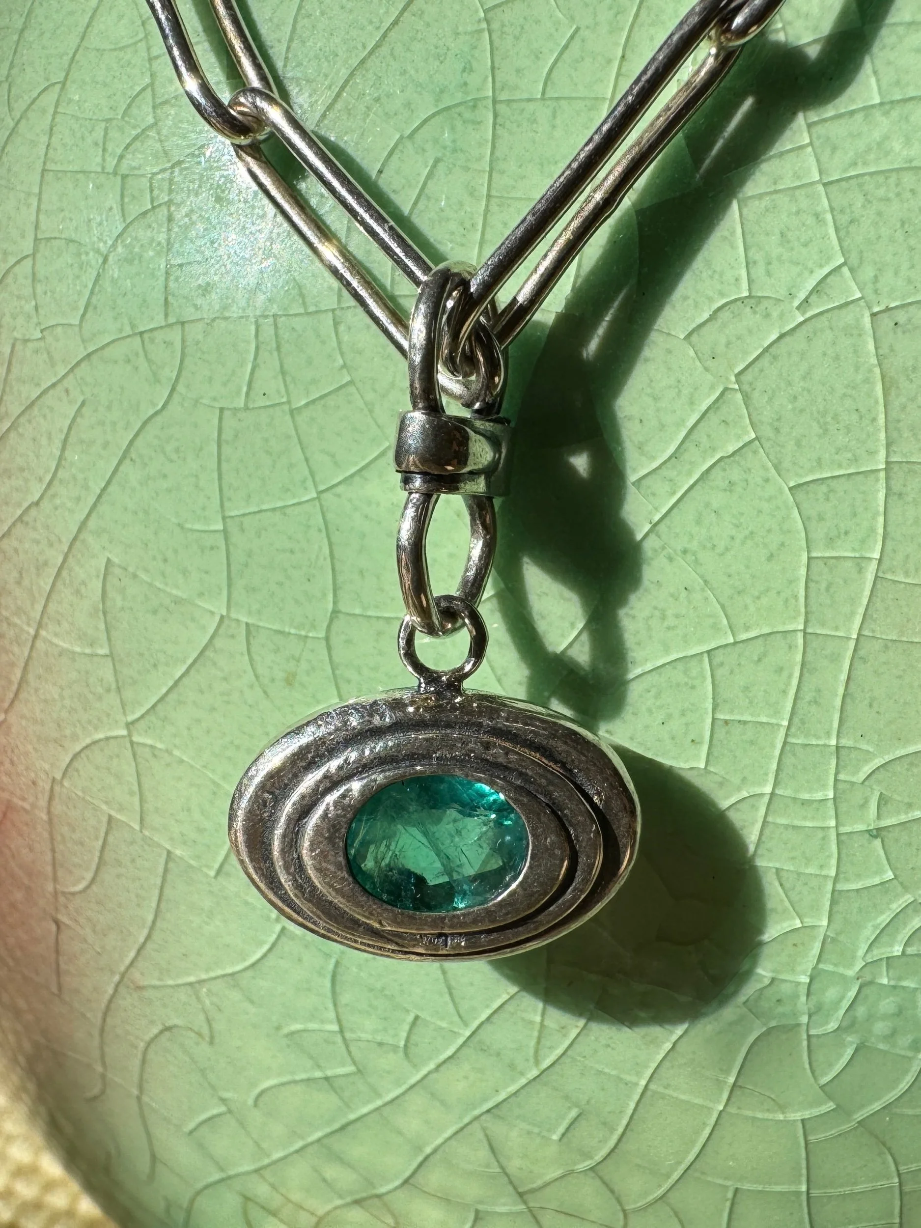 This necklace features a bright green emerald set in silver with a handmade chain. Details below.